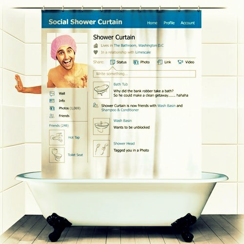 ♥ Op deze website kwam ik dit geweldig leuke douchegordijn tegen. Ik had hem nog niet eerder gezien en schoot gelijk in de lach toen ik hem zag. Zoals je ziet hebben ze op het douchegordijn een Facebook pagina afgebeeld. Links boven in het hoekje kan je er doorheen kijken, waardoor het lijkt alsof je zelf de pasfoto bent. Je kan hem hier kopen voor 19,95 euro.
