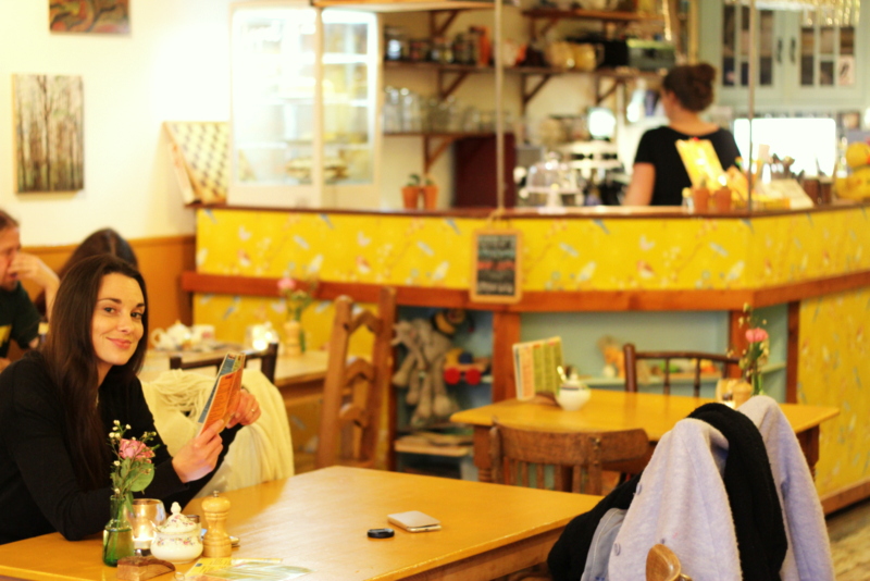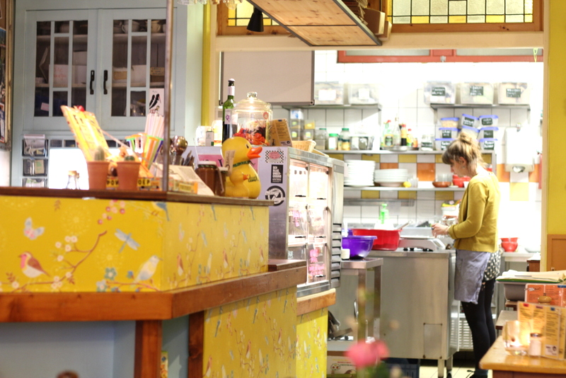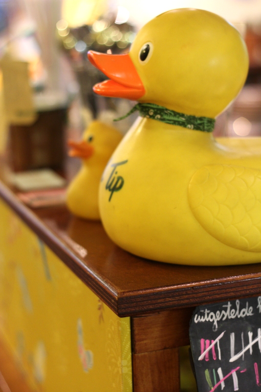 Ook leuk is dat je hier zo de keuken in kunt kijken. Deze oogt een beetje rommelig, maar wel heel schoon. In de vitrines op de bar staan verschillende taarten en hartige hapjes. Ook kneuterige plastic eend vraagt ons stilzwijgend om een tip.