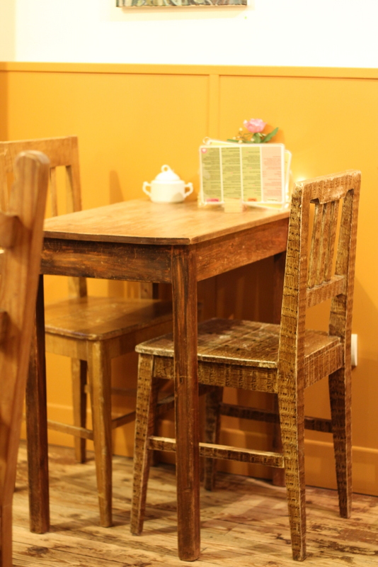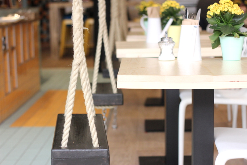 De lunchroom bestaat trouwens nog maar heel kort, sinds 28 februari. De ‘Gefeliciteerd’ en ‘Succes’ kaartjes hingen nog aan de wand toen we binnenkwamen. Het interieur van deze leuke tent is heel tof. De schommels zorgen echt voor iets unieks. Het was wel even een tegenvaller dat de schommels aan de onderkant vastzaken met een ketting aan de vloer ‘Shit, nu kan ik niet schommelen!’ Echt heel fijn zit zo’n schommel ook niet, maar het is zeker een bijzondere ervaring en voor de niet-schommelaars onder ons zijn er ook voldoende ‘normale’ zitjes.