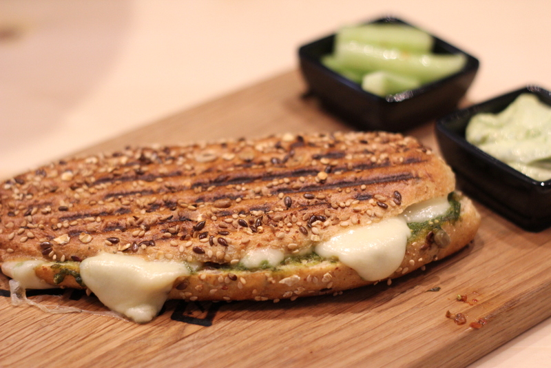 Naast lekkere tosti’s, kun je zoete baksels eten en fijne panini’s. Wij bestelden een panini met mozarella en pesto. Deze was er binnen no-time en zag er heel goed uit. Er zat pesto mayonaise bij en kleine staafjes komkommer. De bruine panini werd geserveerd op een houten plankje.