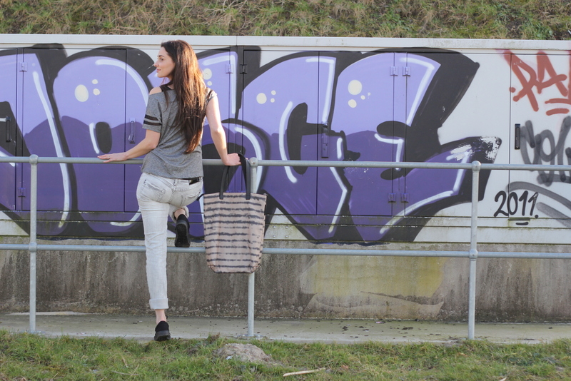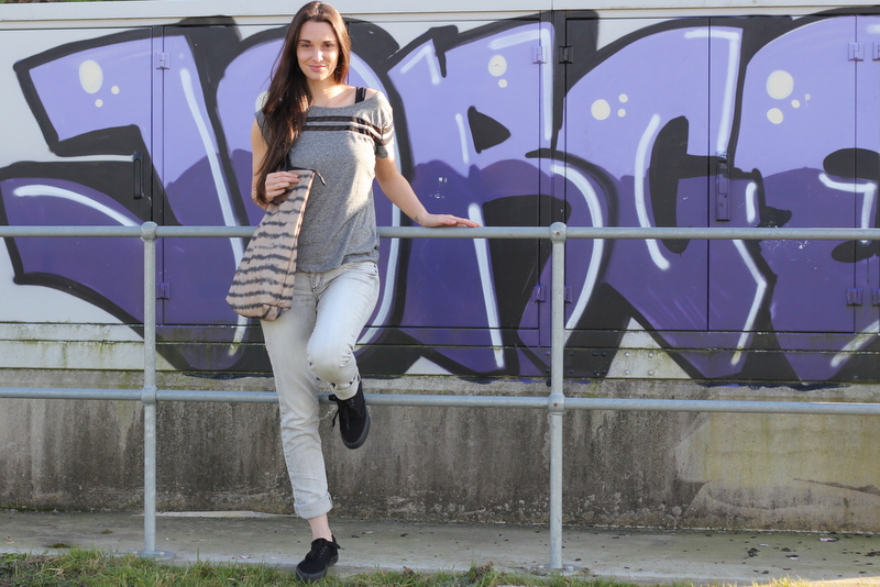 Nu zal ik je mijn outfit laten zien. Ik heb vandaag een eenvoudige, tikkeltje stoere outfit aan. Het shirt met de twee zwarte banen heb ik kort geleden gekocht bij H&M. Het kostte geloof ik 15 euro.