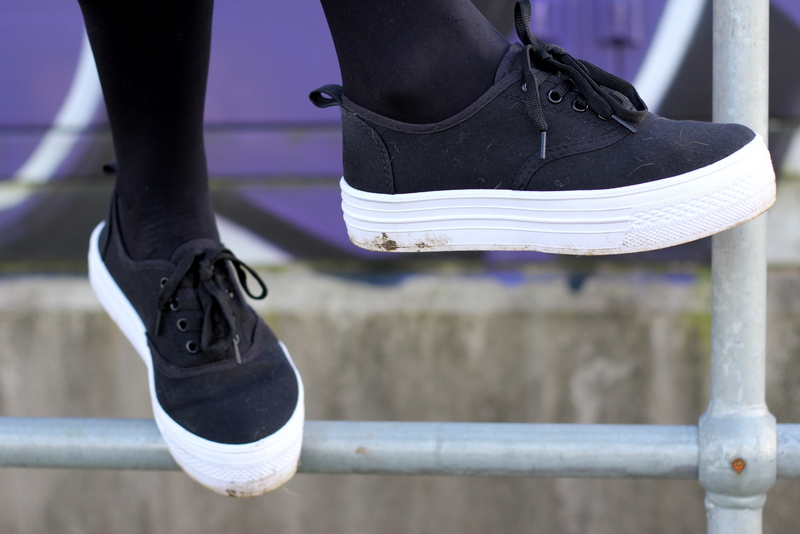 Scarlet draagt onder haar rokje platform sneakers van Primark. Deze worden aankomende lente en zomer helemaal hip. Het voordeel van deze schoenen is dat ze lekker lopen, fijn zitten én je een stukje langer maken zonder daarvoor op pijnlijke killer heels te hoeven lopen. De platform sneakers kosten 7 euro.