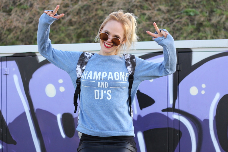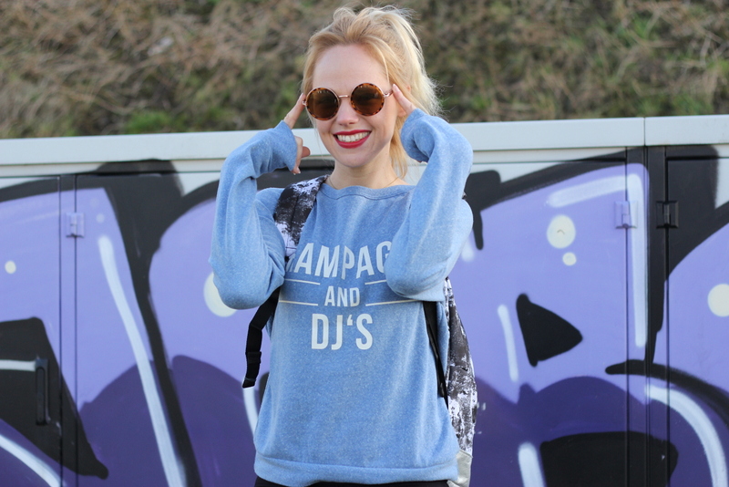 De lichtblauwe Champagne & DJ’s trui is eigenlijk van mij, maar Scarlet draagt hem af en toe ook. Ik kocht hem een weekje geleden voor 15 euro bij New Yorker. Hij is heerlijk zacht en zit daardoor heel lekker. De kleur blauw vond ik heel mooi en de tekst gewoon grappig.