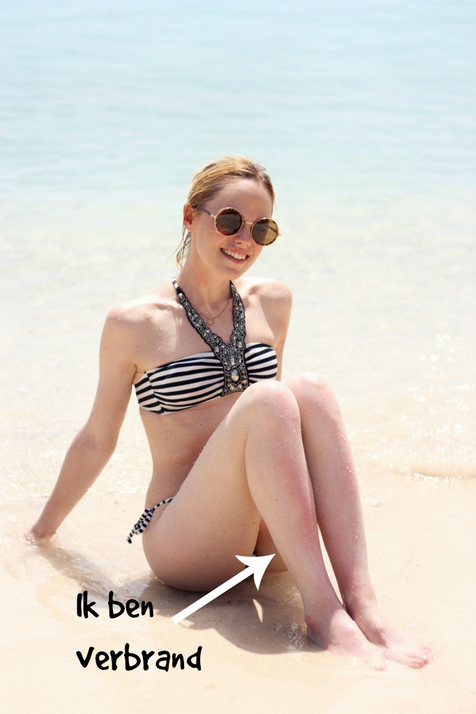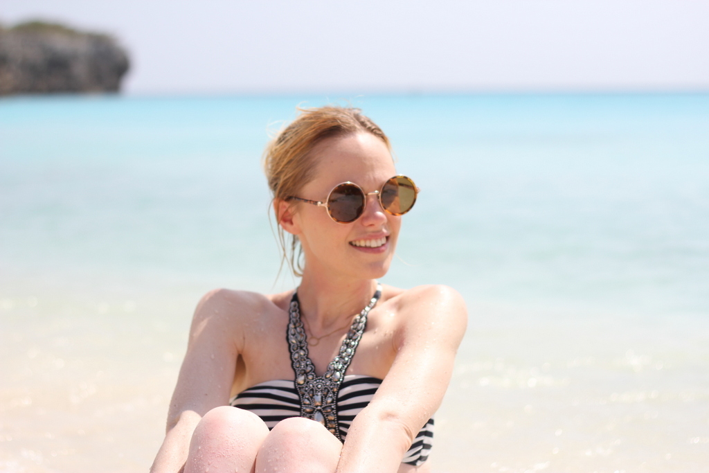 Joyce kocht haar bikini een dag voordat we naar Curaçao vertrokken bij C&A. Heel grappig, want we hadden niet verwacht hier een leuke bikini te vinden. Ze hebben daar soms best leuke items! Ikzelf heb er diezelfde dag ook een mooi, goedkoop kort spijkerbroekje gekocht. In tegenstelling tot mijn bikini die wit is met blauwe strepen, is de bikini van Joyce blauw met witte strepen. We matchen hierdoor heel leuk!