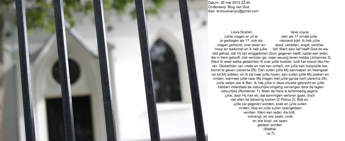 Heel bijzonder dat mensen de moeite nemen om jullie zo’n brief met zulke teksten te sturen. Eerlijk gezegd maakt het me nogal misselijk, totaal ongepast. Ik zat gisteren in de auto met mijn dochter (6) en zij zei: ik denk dat de mensen dingen over God hebben verzonnen. Vrouwen mogen echt wel hun haar laten zien, niemand hoeft ziek te worden zonder prikken en je mag trouwen met wie je lief vindt. Met als toevoeging: maar scheiden mag niet. Ik geef haar gelijk, zo simpel moet het zijn.