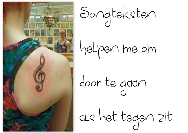 Ik maak dus zelf muziek en dat is echt mijn uitlaatklep. Heerlijk om je gevoelens te kunnen uiten in de muziek. Ook luister ik bijna 24/7 naar muziek. Ik word er rustig van en veel songteksten inspireren me of helpen me om door te gaan als het tegen zit. Daarom heb ik dus deze tattoo laten zetten. Ik zie hem alleen als ik in de spiegel kijk want hij zit op m’n schouderblad maar dat ik weet dat hij er zit geeft al voldoening.