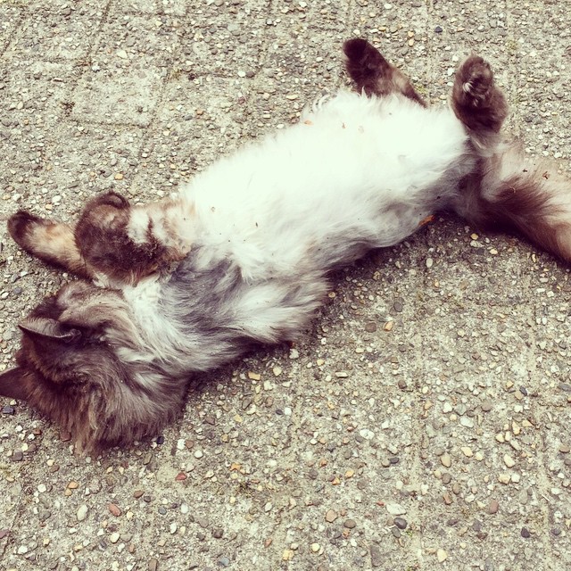 Ik heb vandaag duidelijk te veel van mezelf gevraagd. Ik heb een paar uur gewandeld en ben achter 15 vogels aan gegaan. Ik ben werkelijk uitgeput! Ik kan alleen nog maar liggen en dat is dan ook wat ik doe. Gewoon midden op straat.