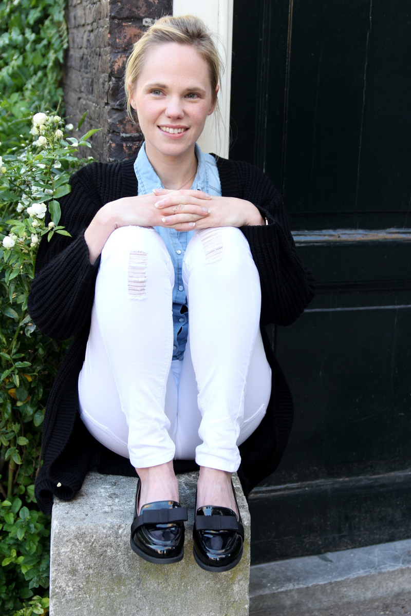 Ik draag een witte ripped skinny jeans bij de spijkerbloes. Een tijdje geleden twijfelde ik nog een beetje over deze ripped broeken, maar deze witte variant vond ik zo leuk en subtiel, dat ik hem wel moest bestellen. De broek zit mooi strak en heeft subtiele, maar toch flink veel, scheuren aan de voorkant onder en op de knie. De broek kost 30 euro.