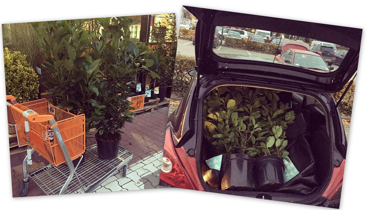 Ze ging gewoon naar Hornbach en haalde hier voor een paar tientjes een paar boompjes. Het was wel even spannend of ze in de auto zouden passen. Maar Scarlet zou Scarlet niet zijn als ze niet even lekker zou doordrukken. Met haar hoofd in de …uhhm takken, reed ze weer naar huis.