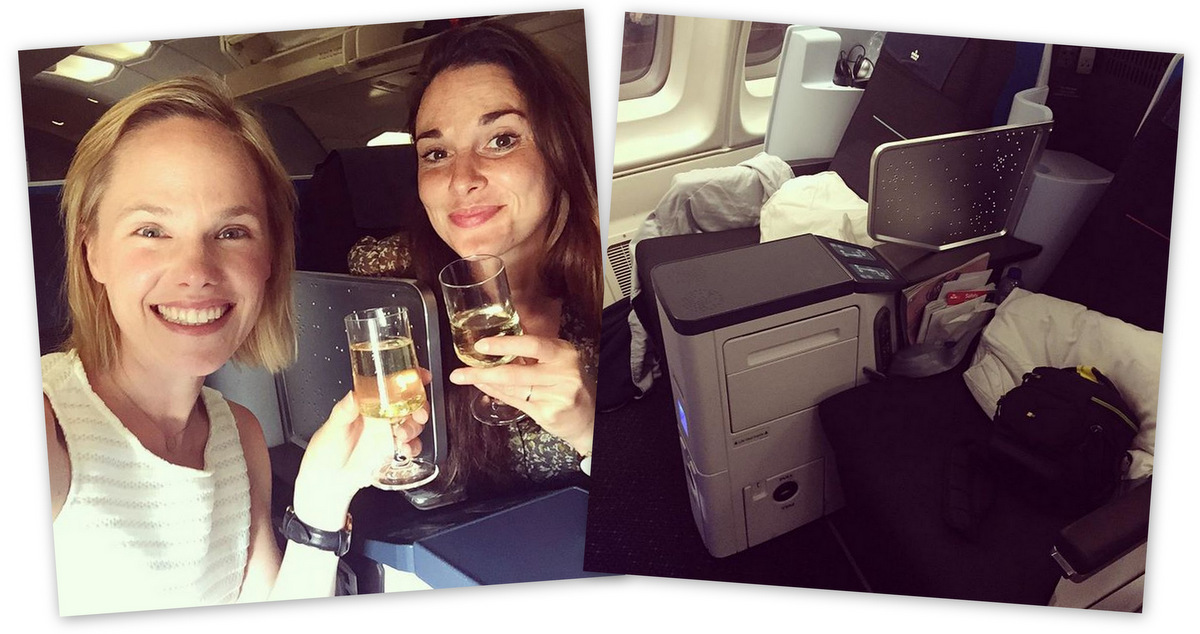 Het vooruitzicht om weer op die heerlijke stoel die helemaal horizontaal gaat te mogen liggen, maakte de terugreis ook wat positiever. Geen nekkramp of half tegen je buurman aan moeten liggen, maar gewoon een heel eigen hok met kussens, dekens, groot tv scherm, driegangen menu en champagne. Heerlijk!