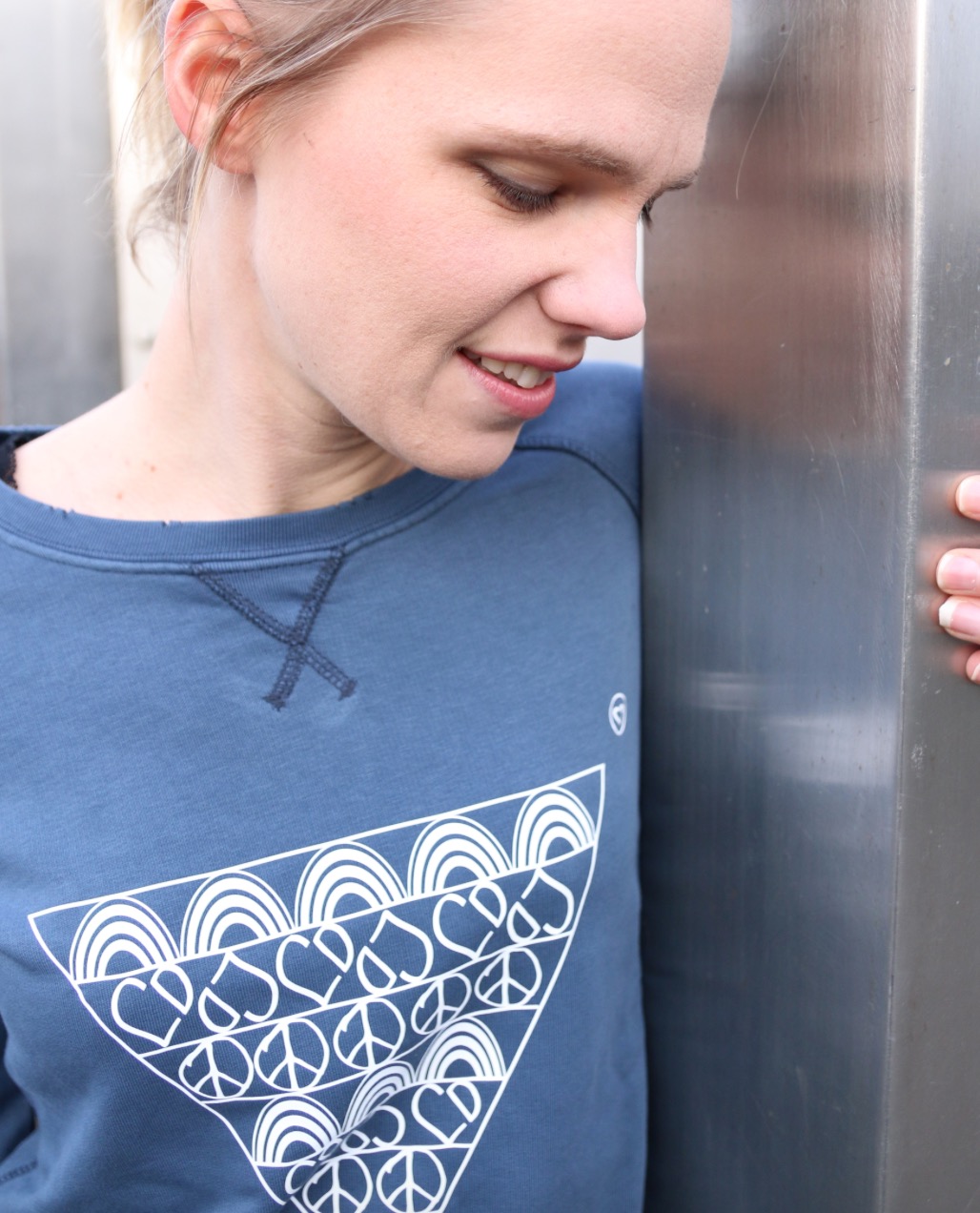 Deze blauwe trui vond ik direct heel tof toen ik hem zag. Blauw staat mij goed en de print met hartjes, peace tekens en regenboogjes vind ik mooi. De naam van de trui is: Every cloud has a silver lining. Dat vind ik een waardevolle tekst, want het is belangrijk om altijd iets positiefs te blijven zien, hoe moeilijk het leven soms ook is.