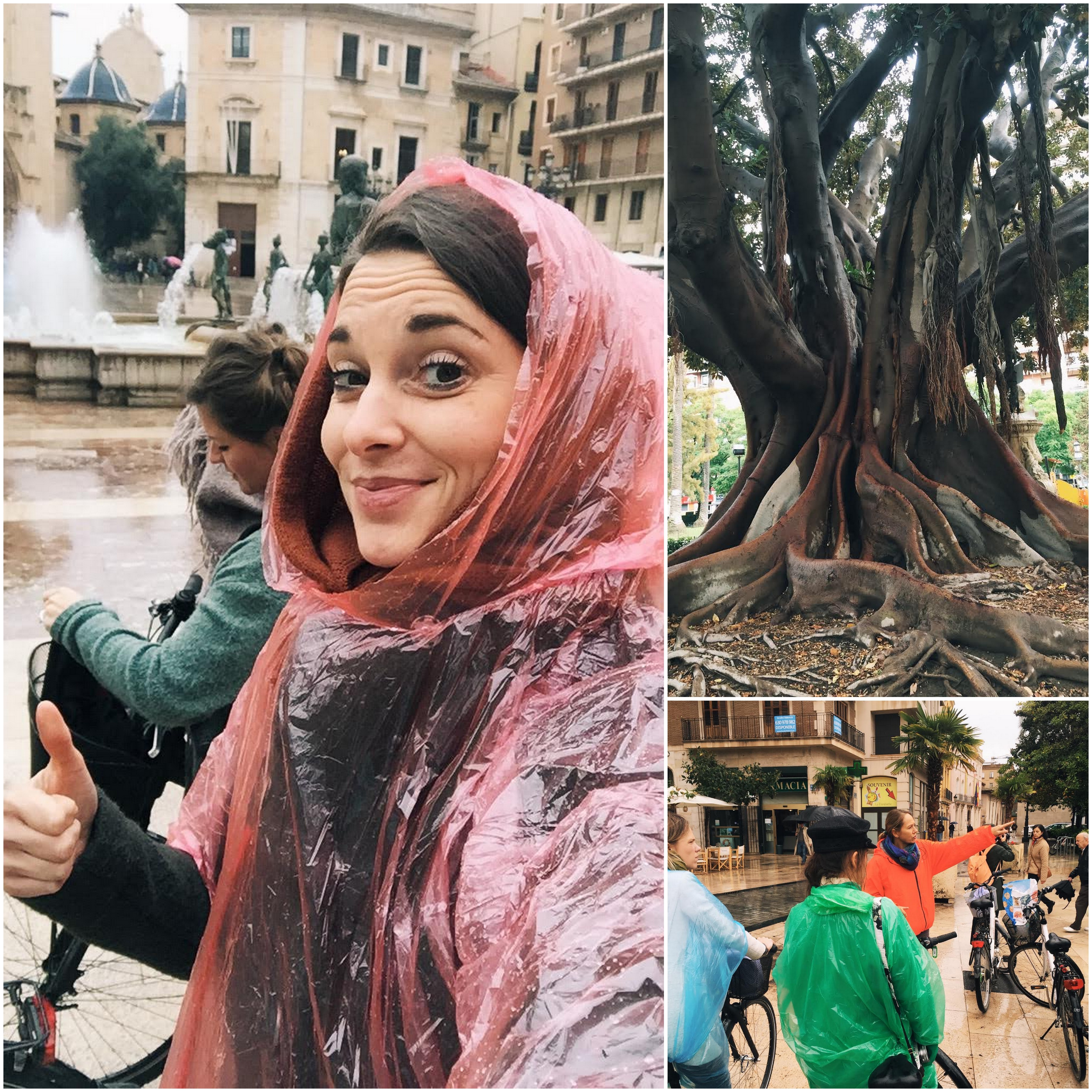 Hierna gingen we weer een fietstocht maken met een gids. Heel leuk, alleen iets minder leuk als het regent en we allemaal met zo’n hippe zak over ons heen moeten fietsen. De stad is prachtig, mooi, modern en oud tegelijk, ….maar je moet wel goed weer hebben. We fietsten via het park naar de haven en kwamen diverse mooie gebouwen tegen. Uiteindelijk kwamen we bij een restaurant in Marina Real Juan Carlos waar we hebben geluncht. Dat was erg gezellig.