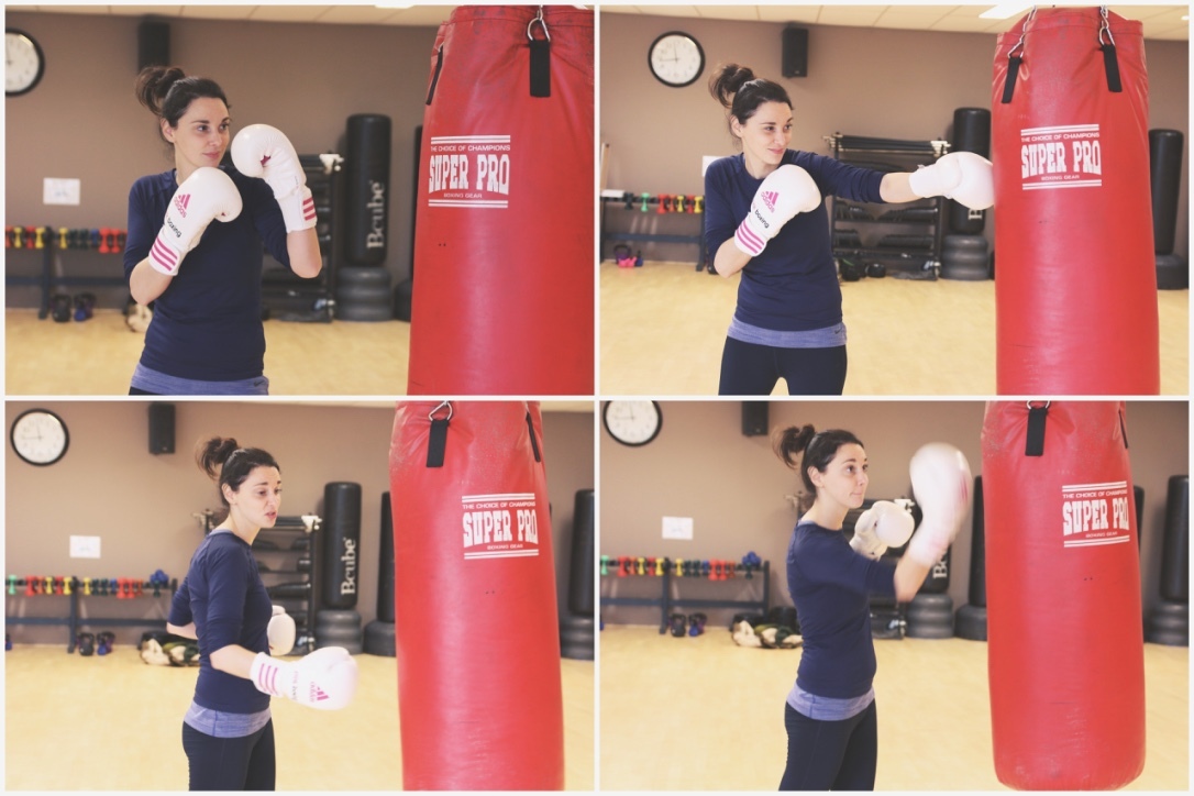 Na de warming up ga je afwisselend in setjes van twee, drie of vier, de bokscombinaties trainen. Dat lijkt niet heel moeilijk, maar doe dit maar eens een aantal minuten lang, zowel stilstaand als rennend door de zaal. Je zal merken dat je bokshandschoenen op een gegeven moment 30 kilo lijken te wegen en je benen als spaghettisliertjes aanvoelen.