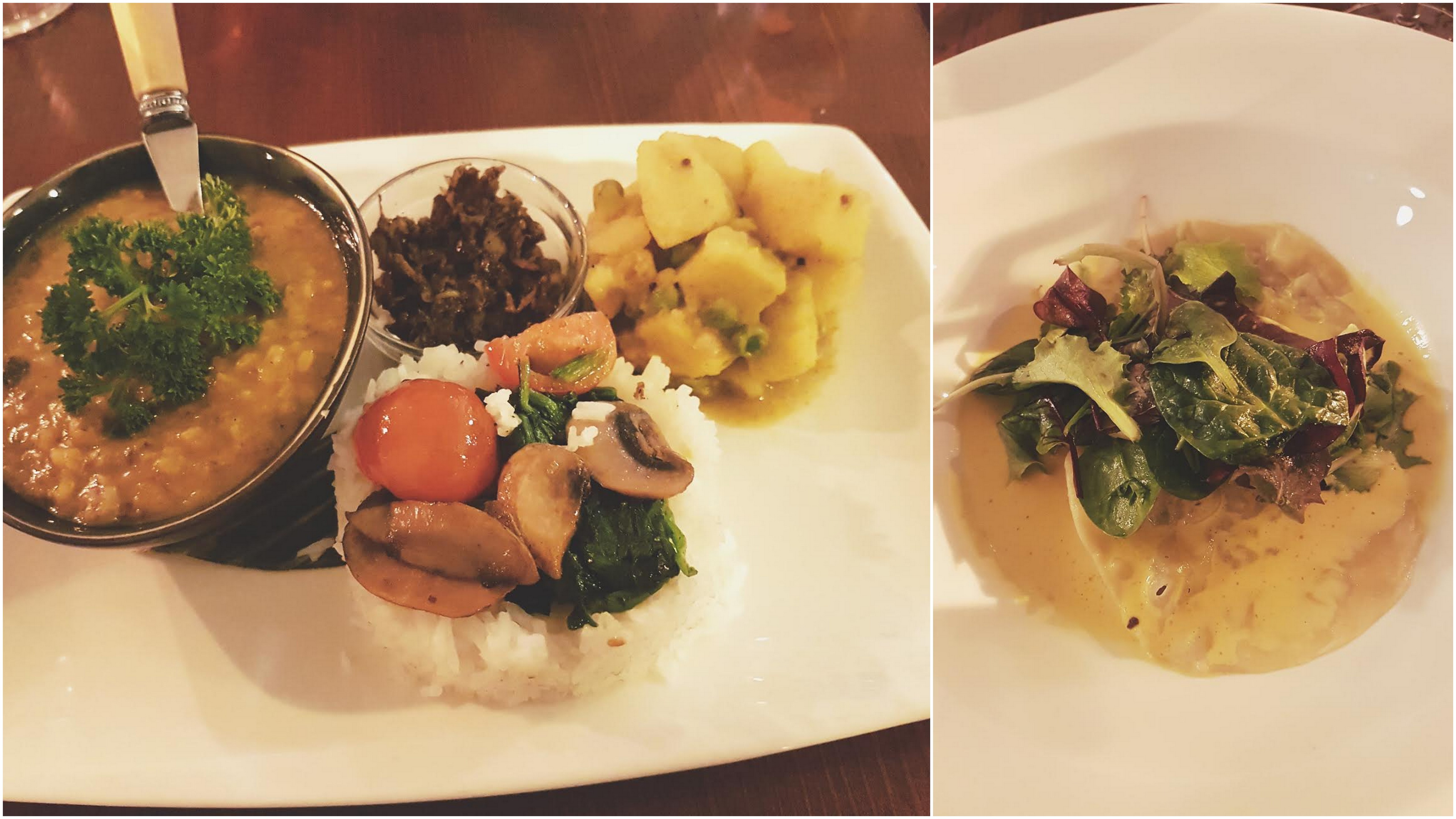 vegetarisch eten in den haagAls eerste namen we de Ravioli en Dahl Kerrie (Indiase linzensoep met kerrie aardappeltjes en rijst). Om zoveel mogelijk te kunnen proeven, spraken we af op de helft te wisselen van bord. Erg handig als je geen keuze kan maken 😉 Beide gerechten waren heel erg lekker en de prijs zeker waard.