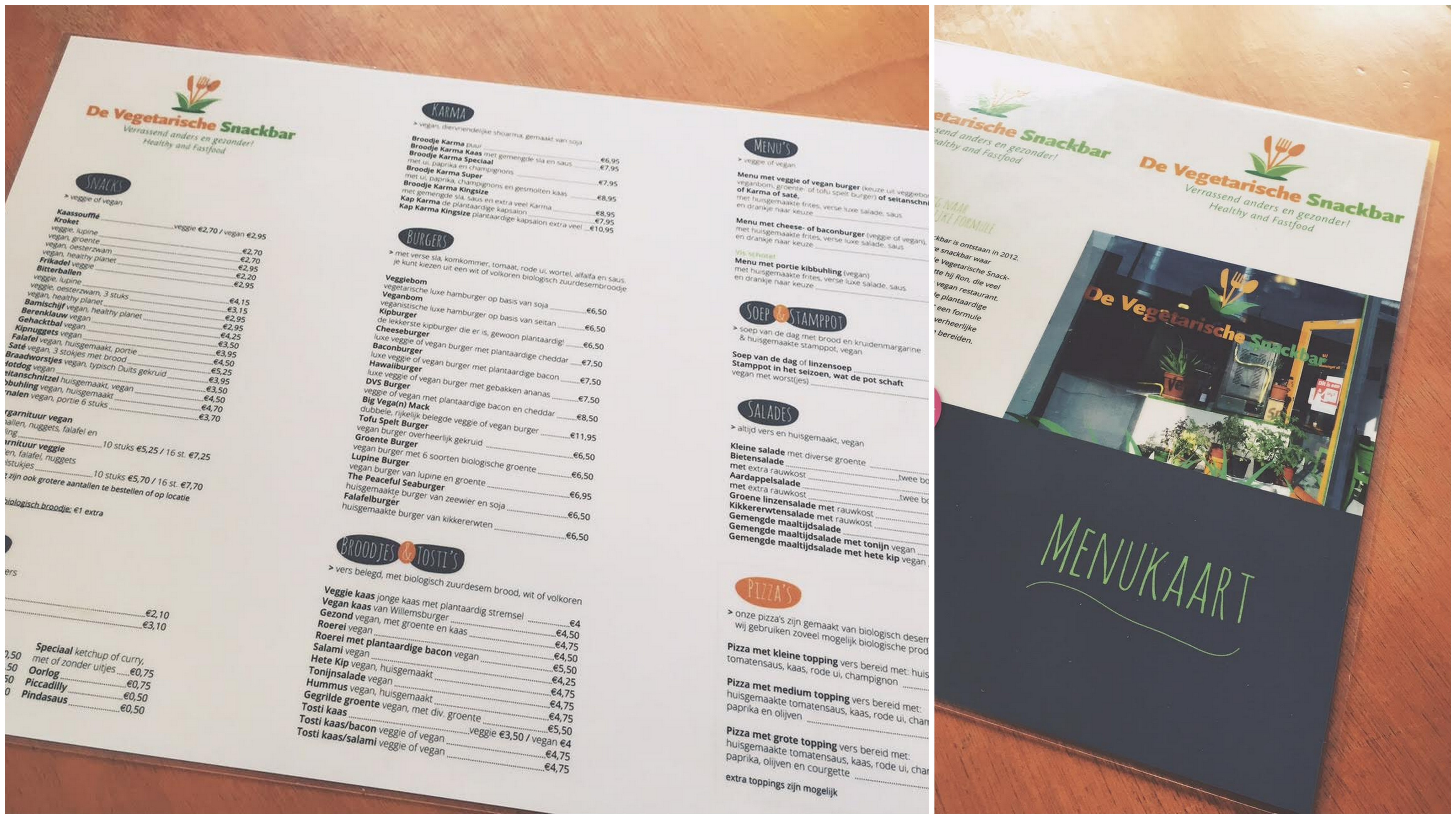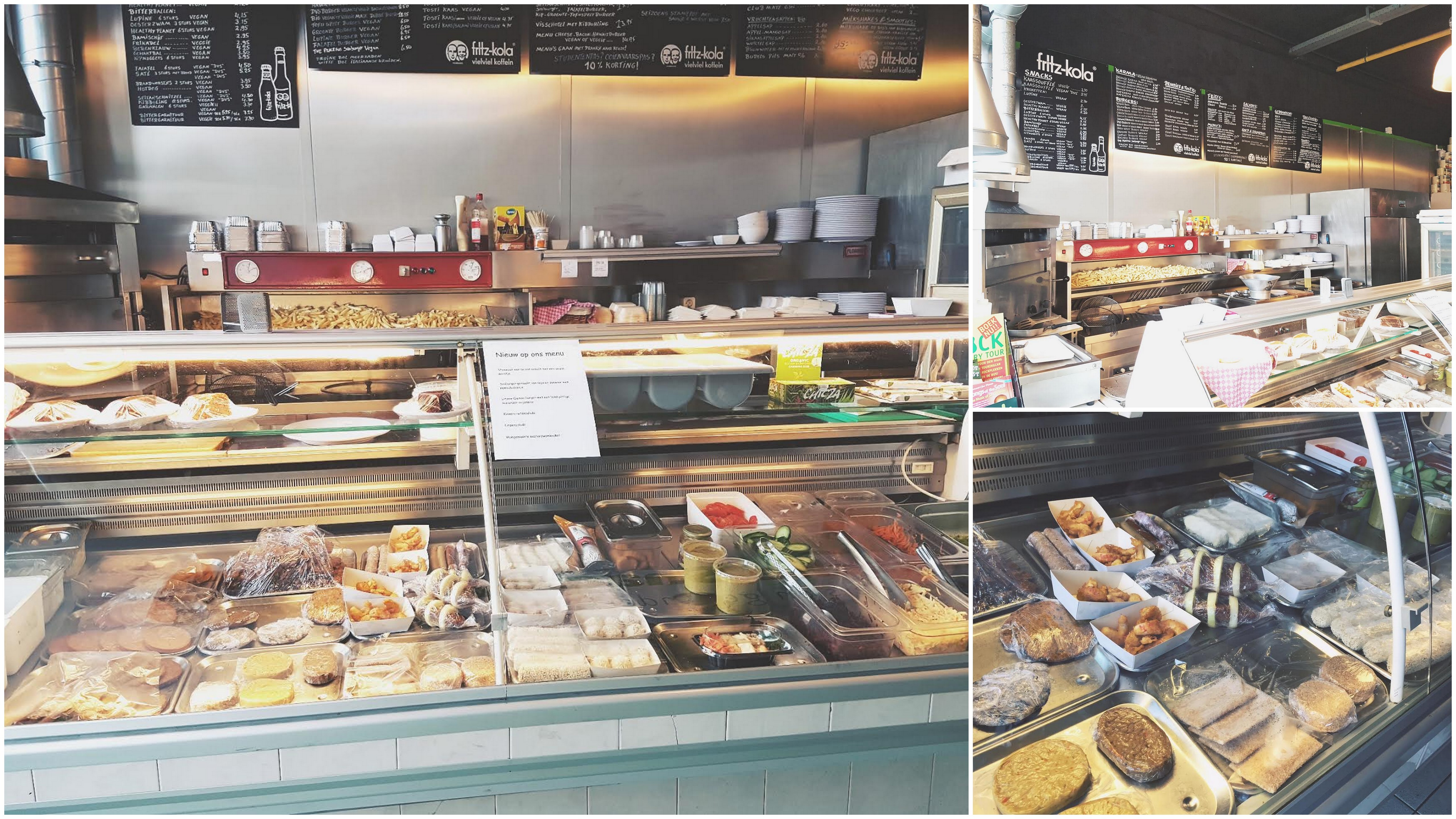 vegetarisch eten in den haagBij binnenkomst loop je gelijk langs de grote vitrine met daarin alle snacks. Erg grappig, want alles ziet er heel gewoon uit. De kroketten lijken op kroketten, de frikandellen op frikandellen en zelfs de garnalen lijken op garnalen. Achter aan de wand hangen een aantal grote zwarte borden met daarop geschreven wat je allemaal kan bestellen. Eigenlijk alles uit de reguliere snackbar, maar dan vegetarisch. Leuk dus!