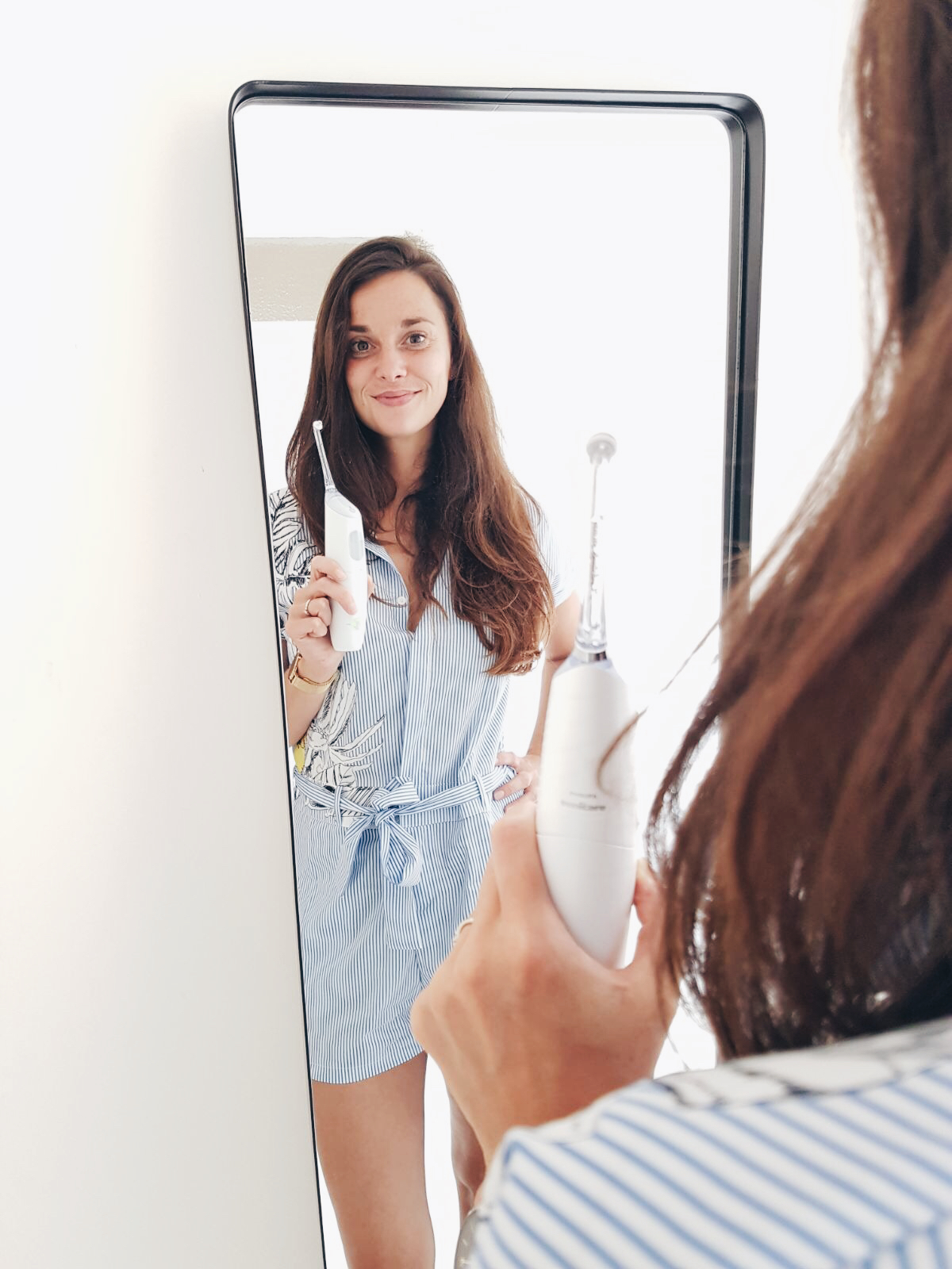 Het was even wennen, als je gewoon flosdraad gewend bent, maar het is wel super handig! Je doet wat water in het reservoir en zet hem vervolgens aan. Met diezelfde knop kan je ook instellen of je 1, 2 of 3 stootjes water per keer wilt. Doe je het liever zonder water, dan gebruik je gewoon enkel de luchtdruk, en heb je het liever iets frissers, dan kan je het water ook vervangen door mondwater. De ruimtes tussen je tanden worden lekker snel schoon, ook bij Scarlet die dus geen flosdraad kan gebruiken. Ik denk dat ik per keer een minuutje of twee maximaal bezig ben. Het voelt lekker fris en mijn tandvlees gaat er niet door bloeden, wat ook wel zo prettig is. Een tip: Houd je mond wel een beetje dicht wanneer je hem gebruikt met water, anders wordt er meer schoon dan enkel je tanden 😉
