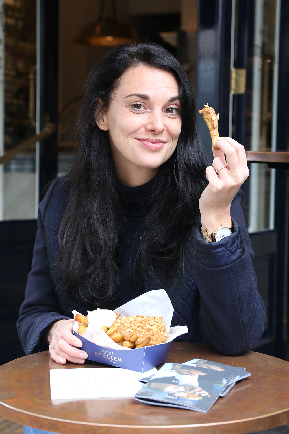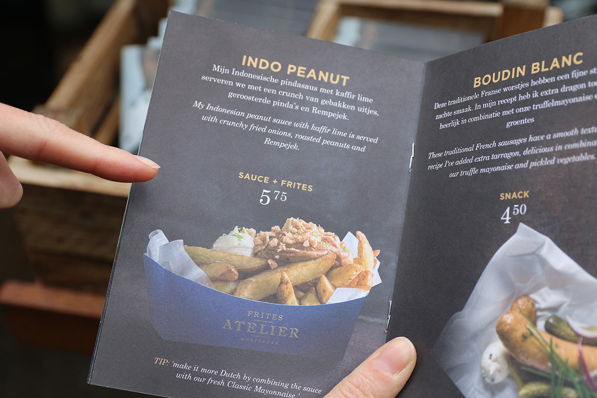 “In Utrecht is het Frites Atelier gevestigd in de Steenstraat naast Sacha. Het is een heel mooi en stijlvol pandje. Buiten staat een houten pilaar met kleine, luxe ogende menukaarten. De friet is wel iets duurder dan je gewend bent, maar je krijgt er dan ook direct veel meer voor dan enkel een simpel frietje. Je kunt hier ook echt niet van doodgewone patat praten 😉 Je kunt echter wel kiezen voor een basis friet voor 3,50 euro en 6 verschillende sausjes. Wil je je smaakpapillen net wat meer laten genieten, dan kan je kiezen uit 3 luxere varianten, waarvan er twee vegetarisch zijn. Wij kozen de Indo Peanut.”