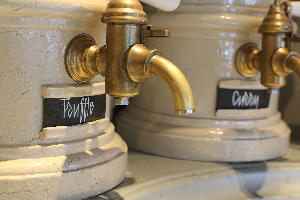 “In het Frites Atelier zien we een prachtig interieur met grote houten kratten vol gesneden aardappels. Het ziet er echt lekker en kwalitatief uit. Er staan bovendien 6 grote kannen met saus voor bij de friet. Het ziet er echt exclusief uit. We zijn dan ook heel benieuwd naar de smaak van ons bestelde frietje. Bij de friet konden we ook nog een snack bestellen in de vorm van Franse worstjes, vast heel lekker, maar voor ons als vegetariërs niet geschikt”