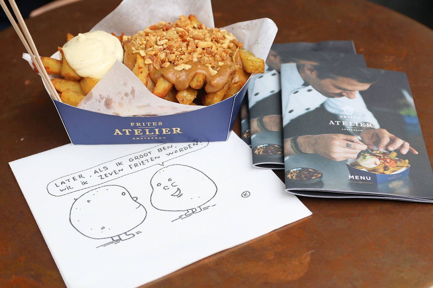 perfecte patatluxe friet. Het ziet er echt heel lekker uit. De friet is heerlijk goudbruin en de satésaus heeft een topping van verbrokkelde pinda’s. Hierbij zit ook nog een truffelmayonaise. WOAHHH! De servetjes die erbij geserveerd worden zijn trouwens erg grappig & schattig! Oké, genoeg gekletst, tijd om te proeven!”