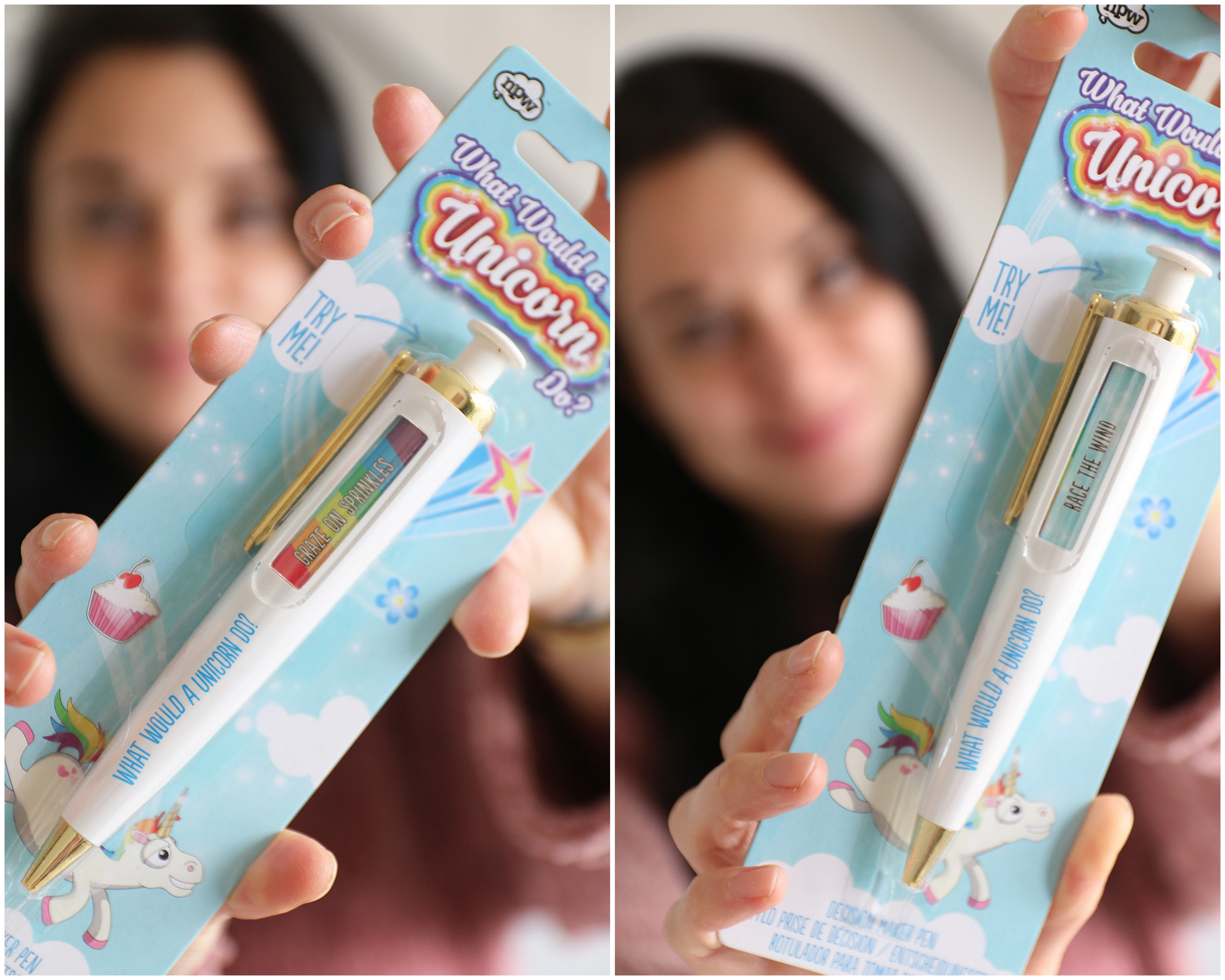 Ben je in het leven ook op zoek naar antwoorden? Dure psychologen en groepsessies bieden geen hulp? De oplossing is lief, schattig, vrolijk en heeft prachtig kleurde manen. Unicorn natuurlijk! Dit magische optimistische beest heeft het antwoord op alles. Hem in je tas stoppen en overal mee naartoe nemen is natuurlijk geen optie en daarom komt hij nu in de vorm van een pen. Weet je het allemaal even niet meer? Bedenk dan gewoon: “What would a Unicorn do?”, en druk op de knop. Door op het einde van de knop te drukken verschijnt het antwoord op je vraag. Geen problemen meer, just graze on sprinkles!