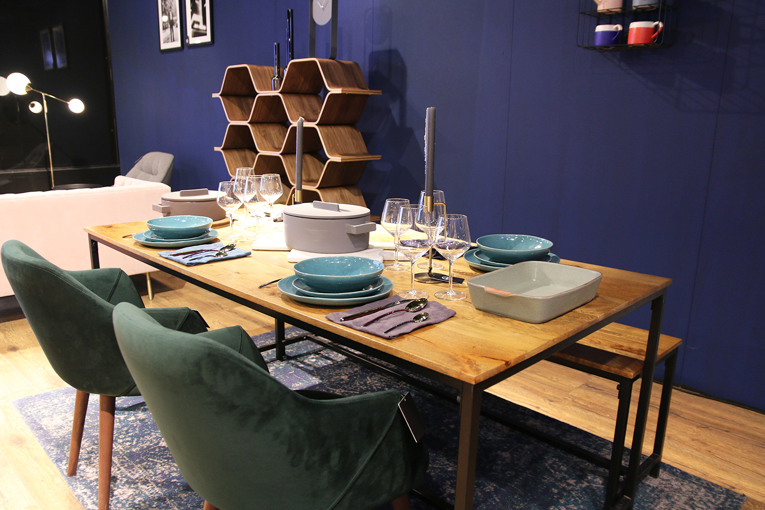 Rechts in de ruimte staat een gezellige tafel prachtig gedekt. Yup, ik zou zo kunnen aanschuiven. Mooi servies en fijne zachte stoelen. Heel gezellig én tof dat ze dit soort items ook verkopen. De kaarsenstandaards vind ik nog wel het overwegen waard voor op onze eettafel.