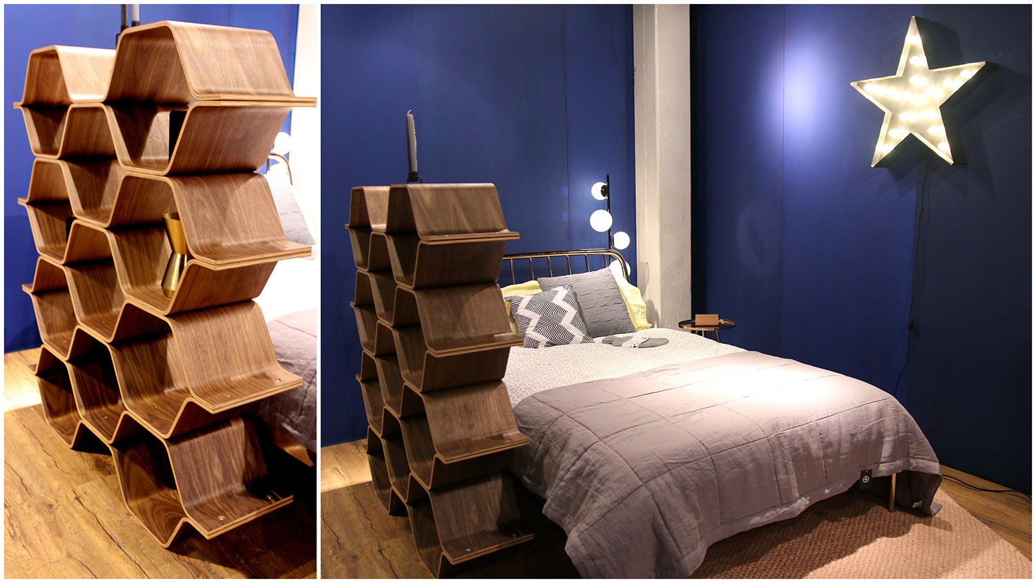 De boekenkast gemaakt van donker hout in zeshoeken vond ik tof. Ik zou deze zo in onze werkkamer neer willen zetten. Nu staat daar nog zo’n rij rek (een soort chique vakkenvulwagen van de Appie) dat half Nederland heeft en in iedere winkel te koop is, haha. Wie weet als we binnenkort nog een bonus krijgen van de kerstman, dat we dit cliché rij rek inruilen voor deze toffe kast! Het bed ernaast vind ik trouwens ook heerlijk. Een beetje Frans door de spijlen, maar hip door de afwerking en kleur.