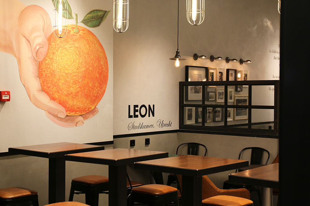De ruimte van LEON is mooi en stijlvol ingericht. Warm en stoer. Er was voldoende plek en het voelde echt gezellig om hier wat te eten. Heel anders dan doorgaans in een fast food tentje. Overal zag je wandschilderingen, lijstjes of mooie quotes.