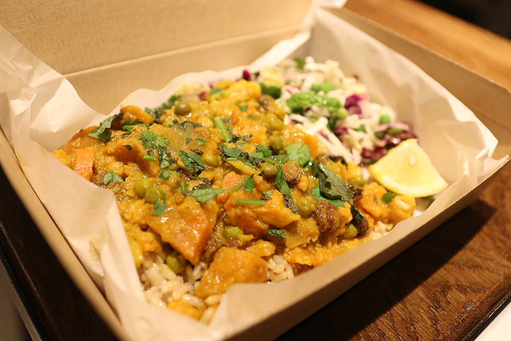 Wij waren in ieder geval erg benieuwd en brachten afgelopen woensdagavond een bezoekje aan LEON om er een hapje te eten. Joyce koos direct voor de Halloumi Avocado Burger en ik ging voor de Sweet Potato & Cauliflower Curry. Hierbij bestelden we beiden een side dish. Joyce de Leon Bakes Fries en ik de ‘geplette doperwten’. Hier vind je het hele menu. We namen op een fijn plekje plaats en binnen 10 minuutjes hadden we ons eten.