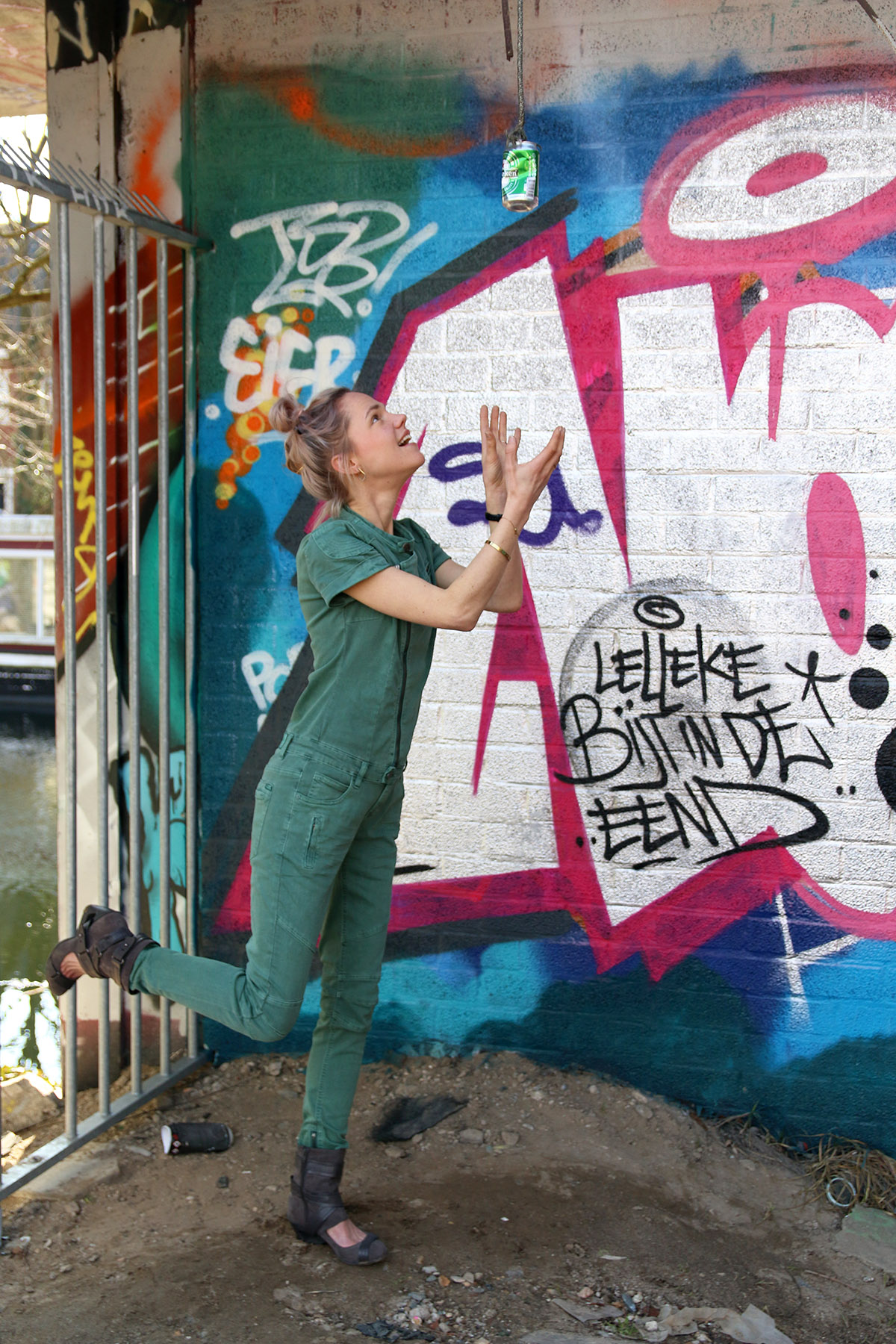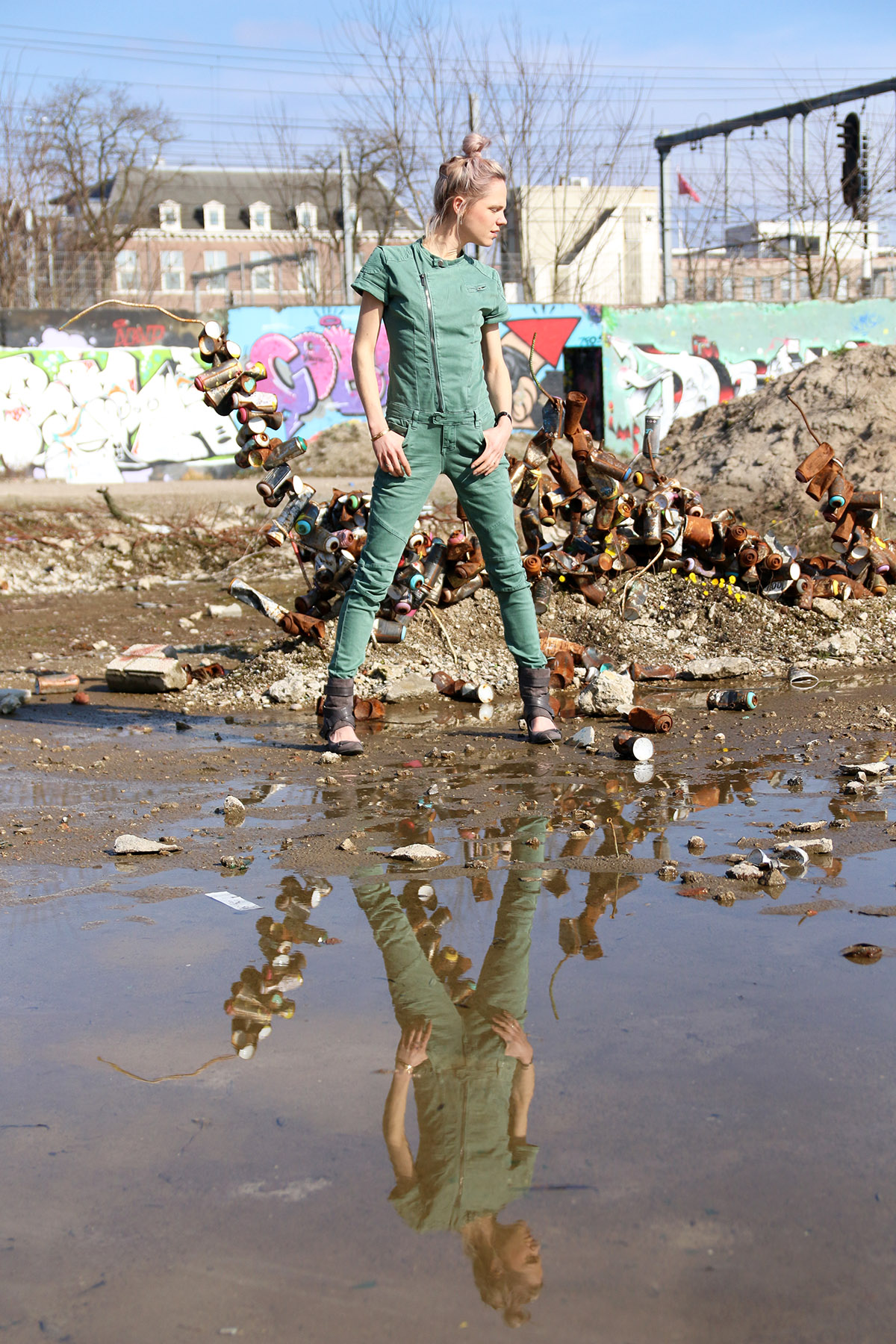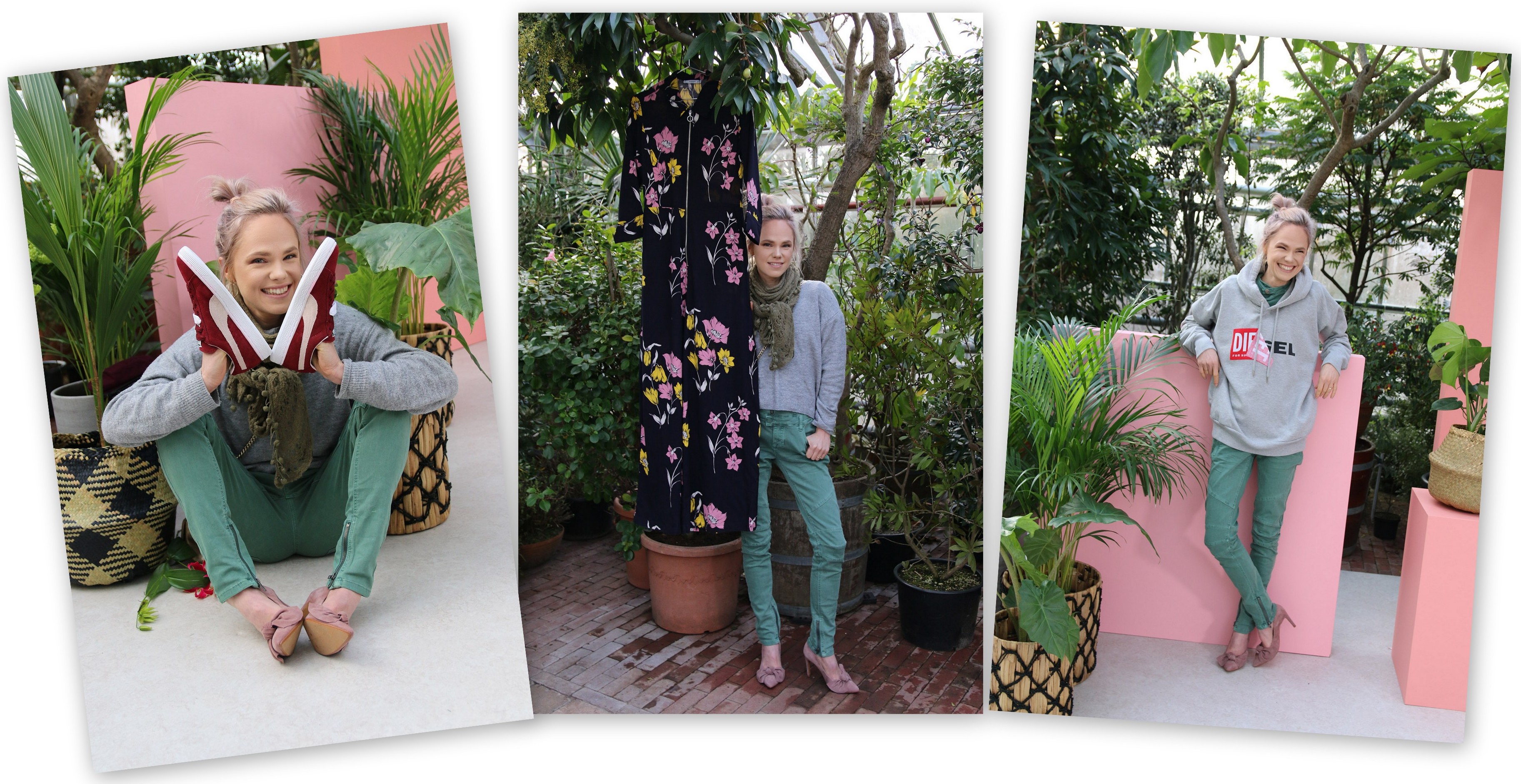 Toen ik de groene Jumpsuit van Circle of Trust in de webshop van Wehkamp zag was ik direct verkocht… en de jumpsuit ook. De kleur, de pasvorm, de stof… hij past helemaal bij mij. Stoer én vrouwelijk. De jumpsuit is ook ideaal voor de lente. Ik bestelde de jumpsuit in maat S, zodat Joyce hem ook aan kan. Tijdens de shoot combineerde ik de jumpsuit met een paar oud roze pumps van Sacha. Prachtige schoenen, die nog lekker zaten ook.