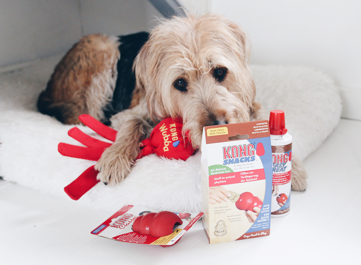 Kort geleden mochten we weer wat leuke nieuwe speeltjes bestellen via huisdierplein.nl. Daar zei Sjors geen nee tegen! Dit keer kozen we voor wat items van het merk KONG. Een merk dat staat voor langdurig speelplezier door de duurzaamheid ervan. Al het speelgoed is gemaakt van natuurlijk materiaal en ook de snacks bevatten enkel natuurlijke ingrediënten. Voor Sjors hebben we onder andere de medium KONG Classic besteld. Een veerkrachtig speeltje van rubber waar je de snacks en easy treat pasta van KONG in kunt stoppen. Deze hebben we er dan uiteraard ook bij besteld.