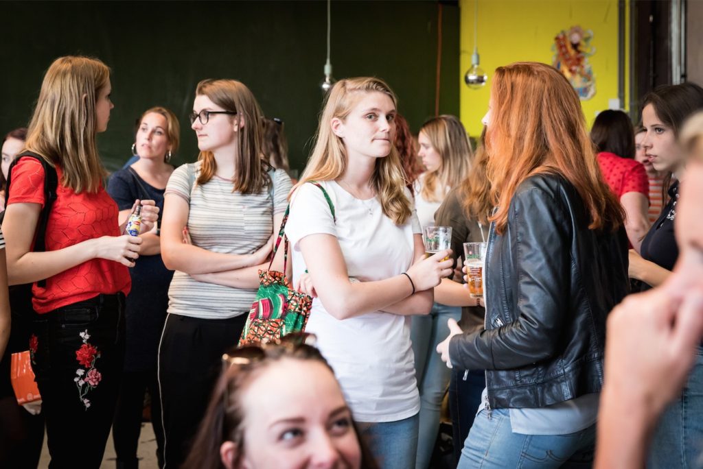 De avond startte met het opbouwen van de locatie. Het podium moest verplaatst, de Volkswagenbus moest naar binnen. De videobeelden van dit maatwerk zijn echt geweldig! Er moest een stuk of 25372829 banken verplaatst én we konden onze versiering ophangen die we kregen van de Feestwinkel.nl. Tegelijkertijd arriveerden ook Bertie, de drukker van ons boek en alle muzikanten voor een soundcheck. Allemaal hielpen ze ook bij het opblazen van de ballonnen en ophangen van de slingers. Enorm lief! We gingen met z’n allen wat eten. Echt aan aanrader bij LE:EN. Sjors arriveerde, onze familie kwam alvast binnen… en toen gooiden we de deuren voor jullie allemaal open. Zo spannend!