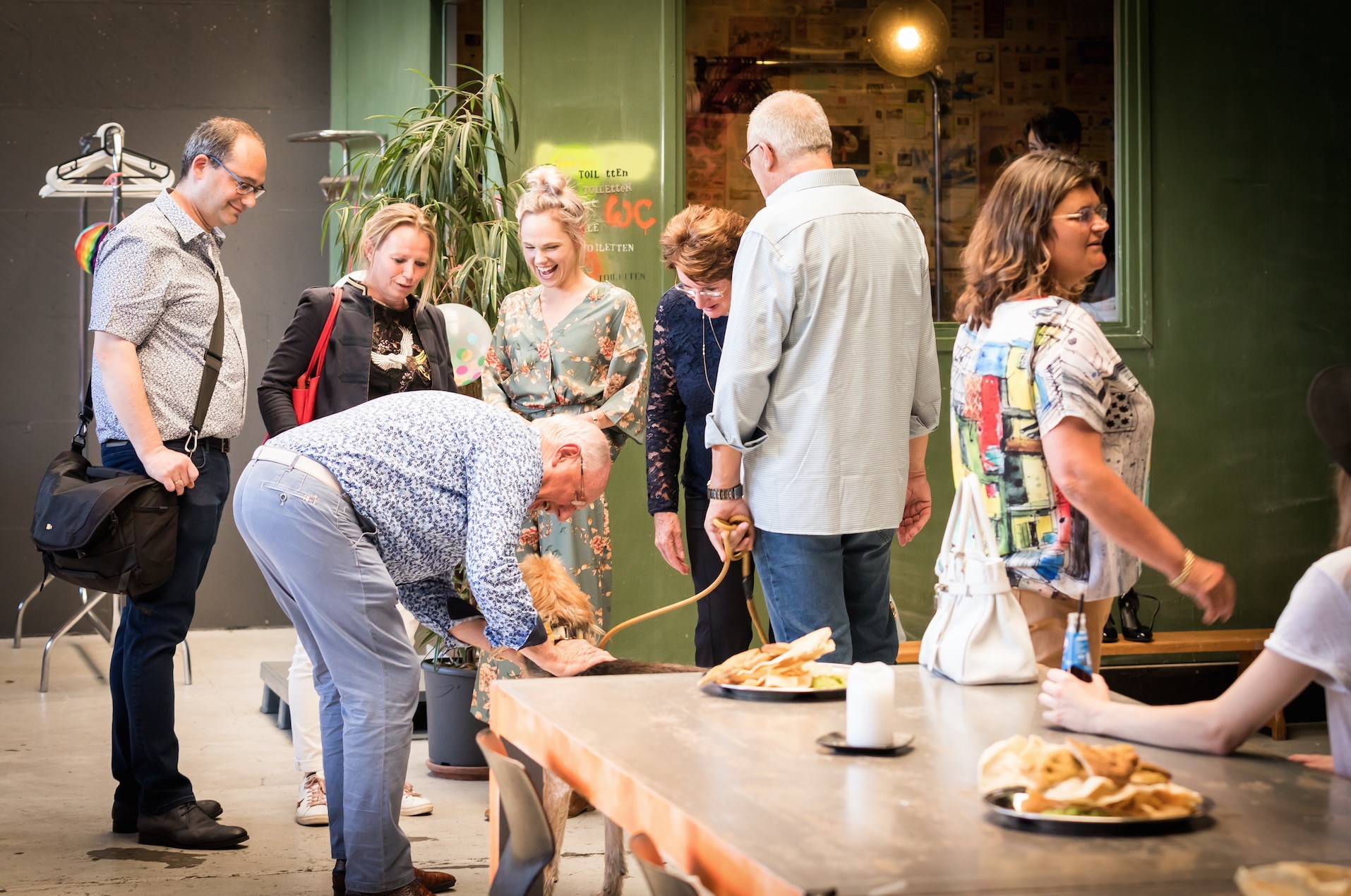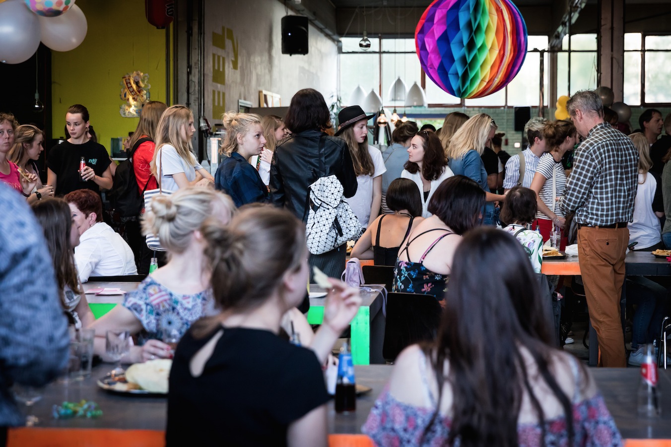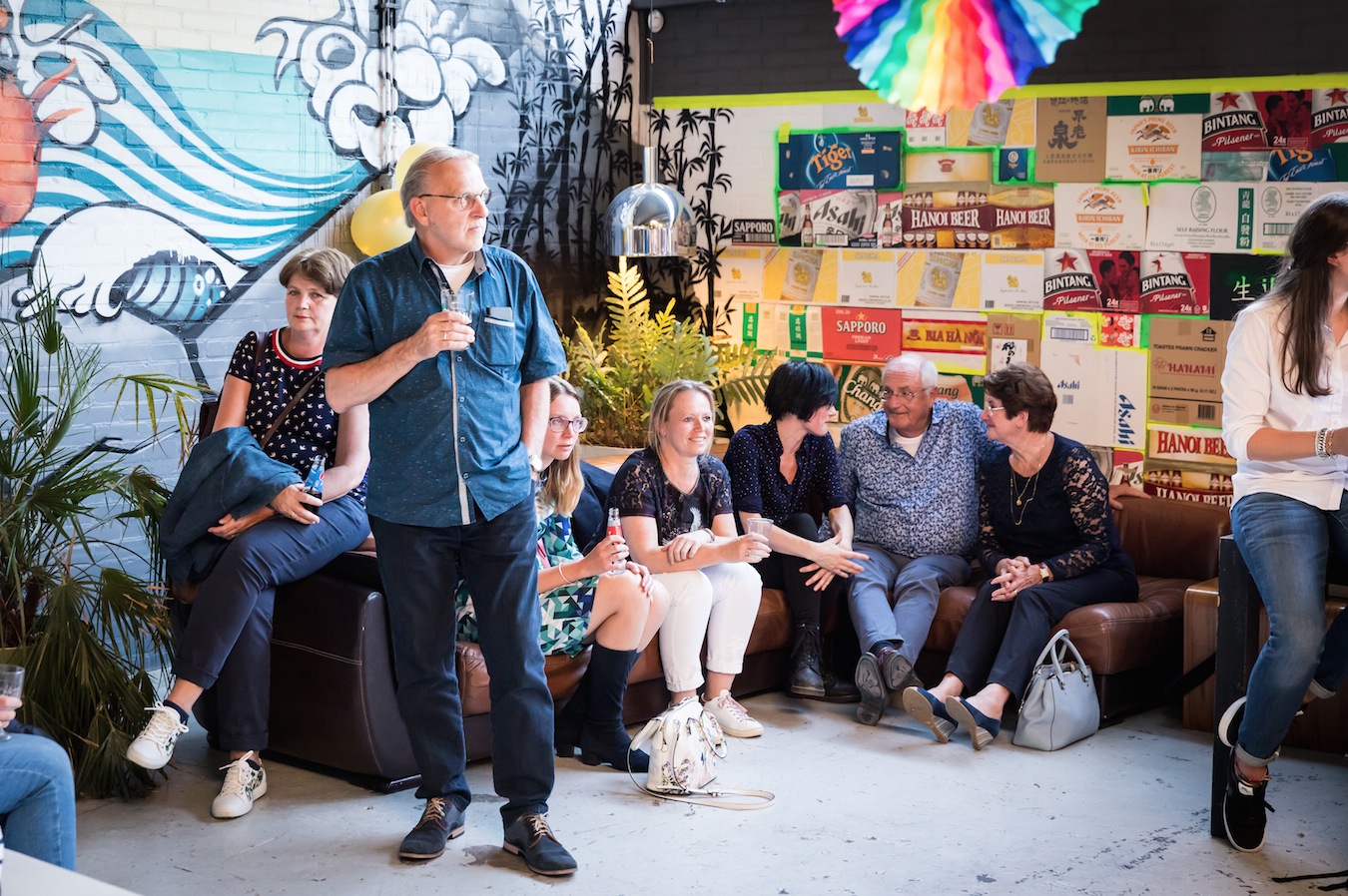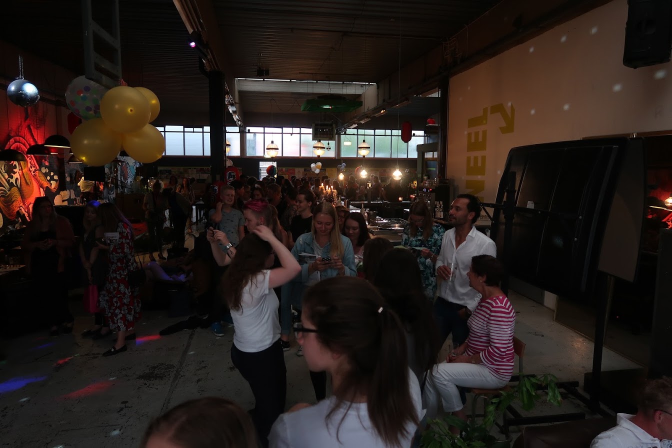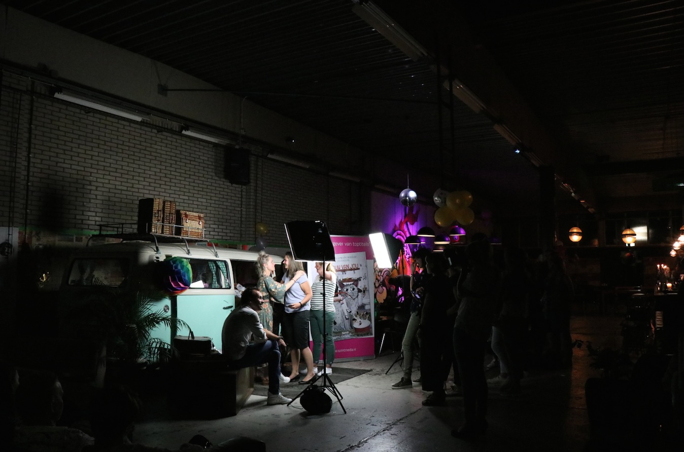 De avond startte met het opbouwen van de locatie. Het podium moest verplaatst, de Volkswagenbus moest naar binnen. De videobeelden van dit maatwerk zijn echt geweldig! Er moest een stuk of 25372829 banken verplaatst én we konden onze versiering ophangen die we kregen van de Feestwinkel.nl. Tegelijkertijd arriveerden ook Bertie, de drukker van ons boek en alle muzikanten voor een soundcheck. Allemaal hielpen ze ook bij het opblazen van de ballonnen en ophangen van de slingers. Enorm lief! We gingen met z’n allen wat eten. Echt aan aanrader bij LE:EN. Sjors arriveerde, onze familie kwam alvast binnen… en toen gooiden we de deuren voor jullie allemaal open. Zo spannend!