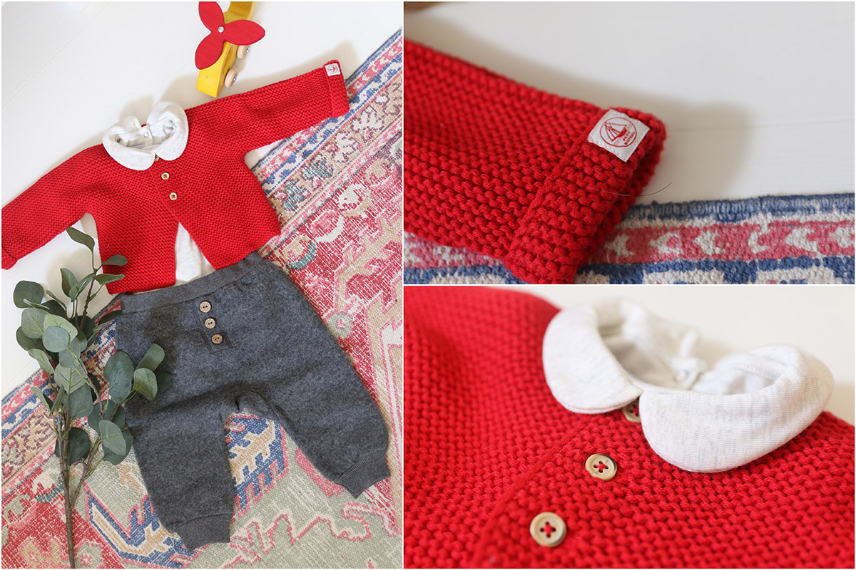 Tenslotte kozen we van Petit Bateau ook een rood, gebreid vestje uit. Het vestje bevat kleine bruine knoopjes aan de voorkant en kan je leuk dragen over de romper met kraagje. Is deze outfit niet te meisjesachtig? Ach… wie bepaalt dat? Wij vinden het een prachtig setje en kunnen niet wachten tot onze kleine man erin zit.