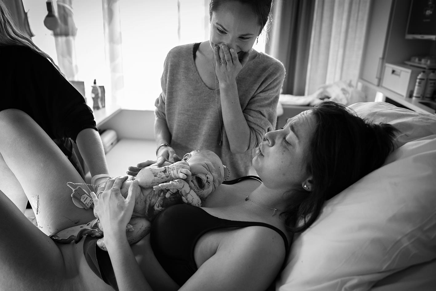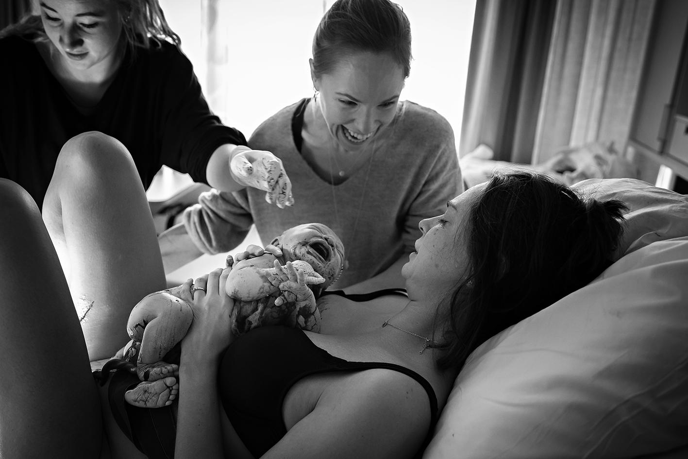 Met al mijn resterende kracht deed ik mijn best om dan eindelijk dat mannetje tevoorschijn te halen. Een bizar gevoel wanneer dat hoofdje eruit komt en nog gekker wanneer het schoudertje komt. Een bevrijdend gevoel. En dan ineens… is daar een klein mensje. Zojuist nog in mijn buik en nu op mijn buik. In een woord; onwerkelijk.