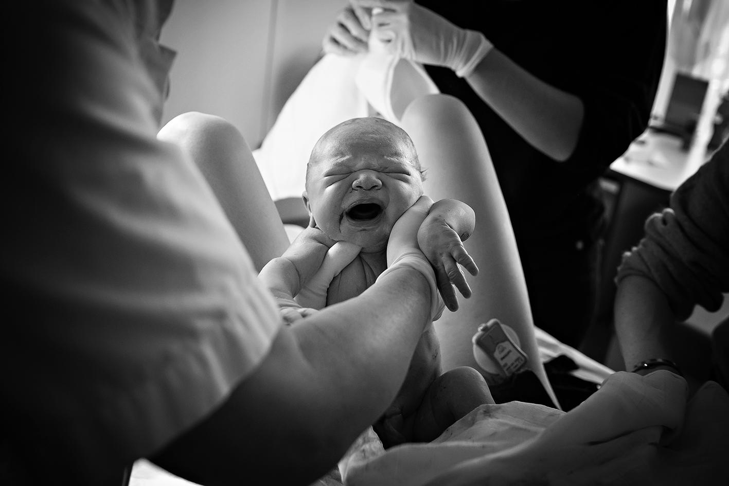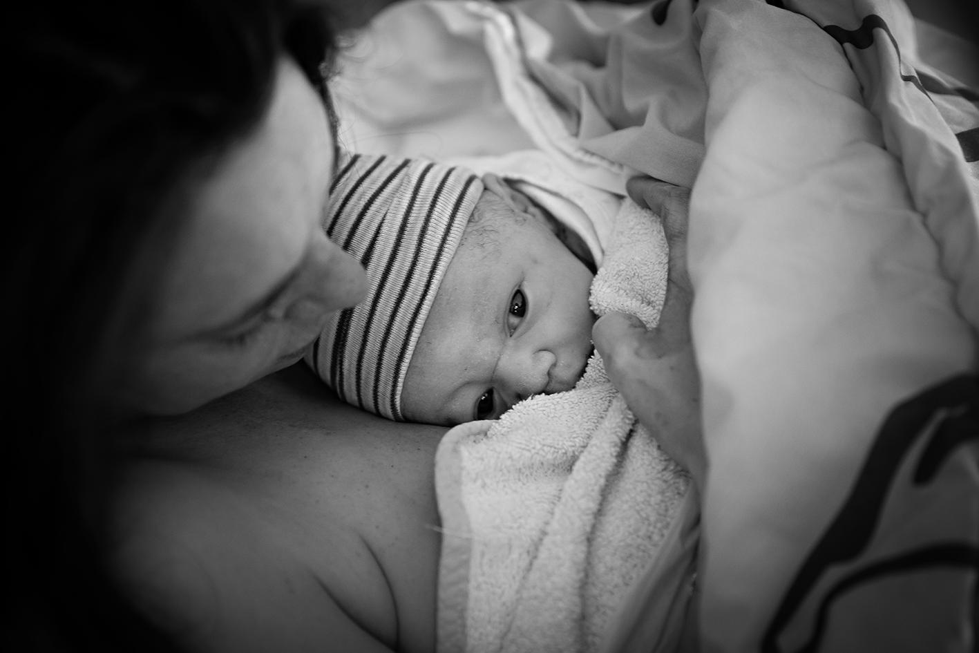 Joyce ging weer op bed liggen en kon na een klein onderzoek verder met persen. Hij moest nu echt gaan indalen anders duurde het te lang. Ineens rond 12:55 uur zagen we de bovenkant van het hoofdje… en toen was het snel gedaan. Met nog een paar pittige persen kwam Hunter om 12:58 op aarde. Bonjour!