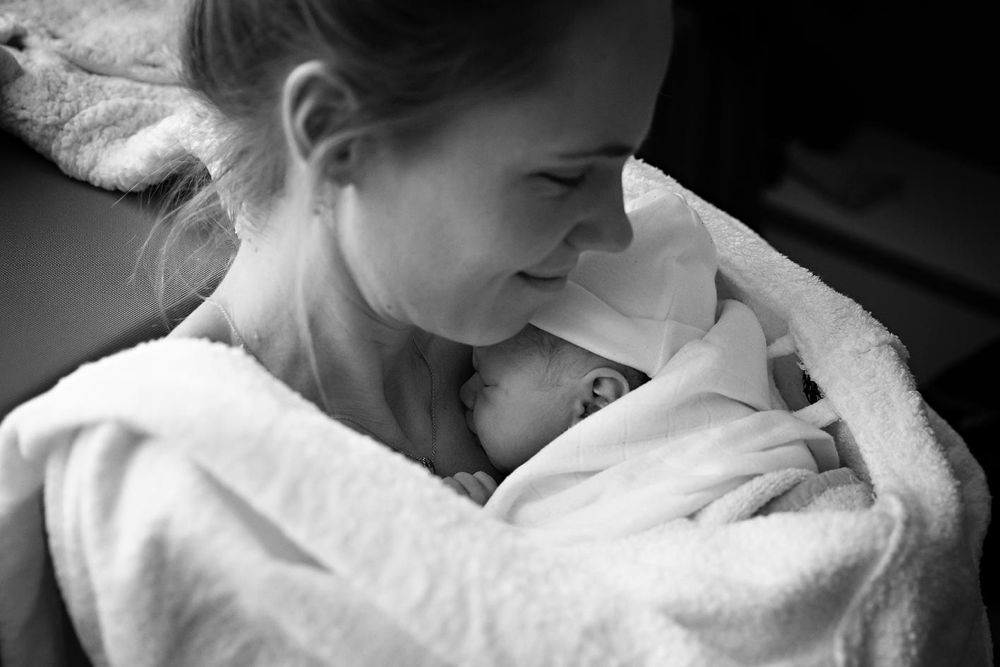 ‘Ik was er eigenlijk gelijk heel zeker van dat ik een geboortefotograaf bij onze bevalling wilde. We leggen toch al alles vast, waarom dan ook niet dat. Achteraf gezien ben ik nog blijer dat we dit hebben gedaan. Ik weet natuurlijk nog prima hoe de bevalling is gegaan, maar toch zit je ook in je eigen cocon op het moment van bevalling. Je bent alleen maar hard aan het werk om dat mensje op aarde te brengen en maakt hierdoor niet alles heel bewust mee. Ik vind het super bijzonder om het nu terug te kunnen zien. Ik heb zelf niet heel veel babyfoto’s en vroeger werd dit ook nog helemaal niet gedaan, maar ik had het zeker leuk gevonden om mijn eigen geboorte te zien. Met Jessica was er gelijk een klik. Ze is heel rustig en geïnteresseerd. Ik moet ook bekennen dat ik het nauwelijks heb meegekregen dat ze er was tijdens de bevalling, zo natuurlijk ging het.’