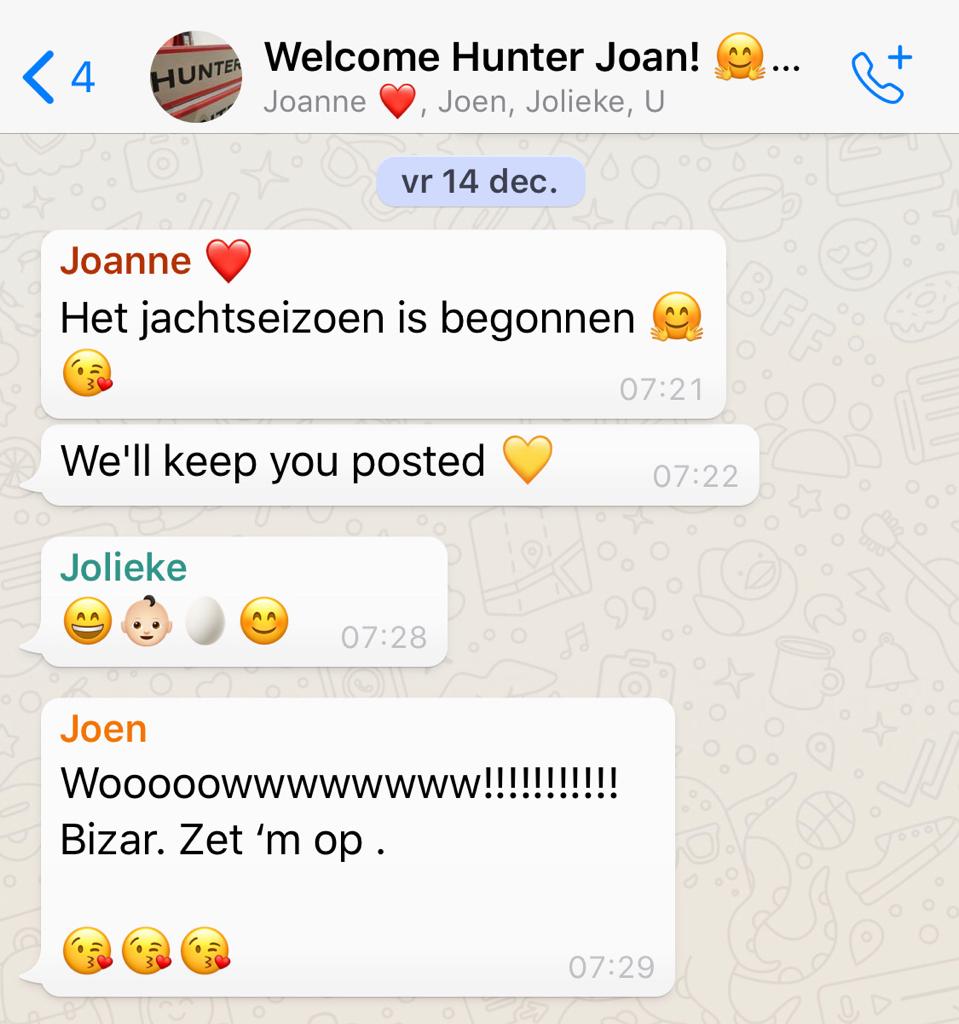 Rond half acht lieten we Joen en Jolieke weten dat de weeën waren begonnen. Zo wisten zij dat ze in de omgeving van Utrecht moesten blijven die dag. Zij wisten de naam van onze zoon al en daarom hadden we afgesproken de zin ‘Het jachtseizoen is geopend!’ te appen als het moment daar was. Eigenlijk ging het, wat mij betreft, allemaal best soepel.